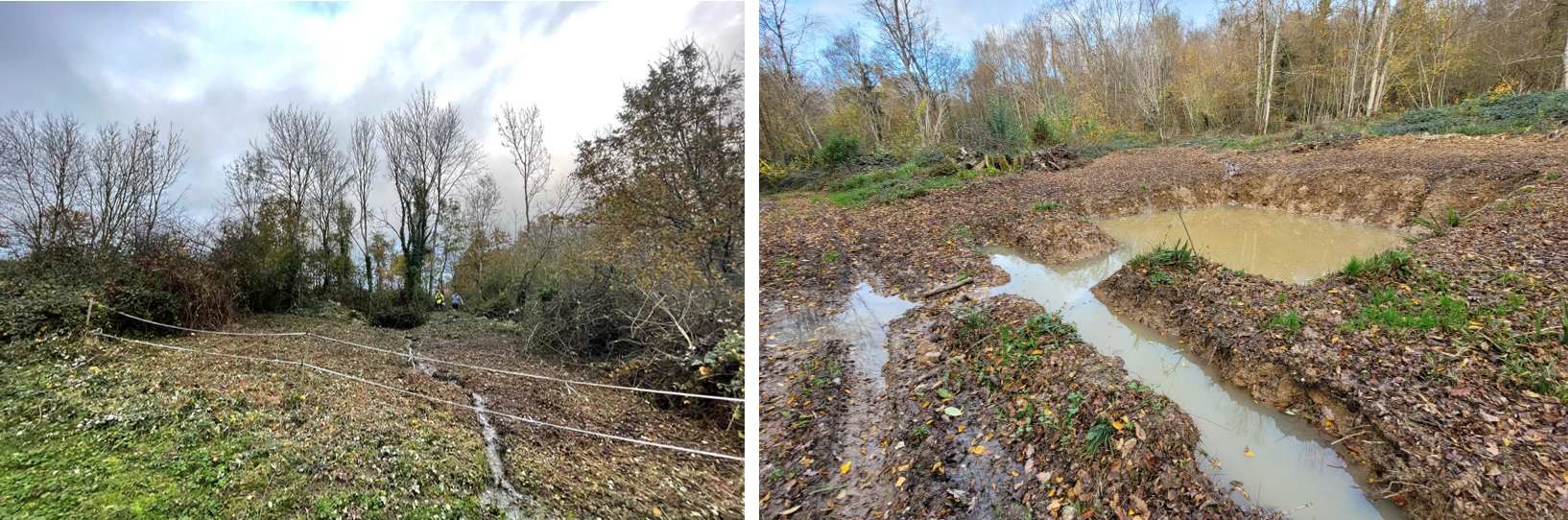 De plus, le CPIE réalise le suivi scientifique de trois espèces et d’un habitat d’intérêt communautaire : le Triton crêté (Triturus cristatus), le Sonneur à ventre jaune (Bombina variegata), le Cuivré des marais (Lycaena dispar) et les Prairies maigres de fauche de basse altitude (cf. photos ci-dessus). Les résultats de 2023 ont montré un déclin des effectifs de Sonneur à ventre jaune et de Cuivré des marais, à l’inverse des populations de Triton crêté, qui semblent bien se porter. De plus, un tiers des prairies de fauche échantillonnées ont été converties ou se sont refermées. Des travaux en faveur du Sonneur à ventre jaune ont été réalisés à l’automne sur la commune d’Orly-sur-Morin au niveau de plusieurs parcelles privées (création et restauration de mares et d’ornières).
