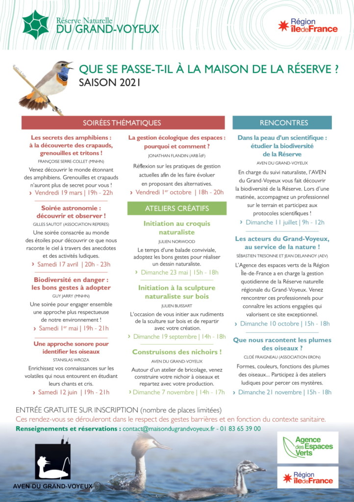 Chaque année des événements culturelles sont organisés à la maison de la Réserve du Grand-Voyeux, voici le programme événementiel 2021. Plusieurs manifestations sont prévues : 5 soirées thématiques, 3 rencontres et 3 ateliers créatifs.