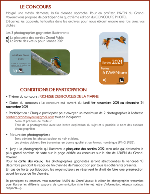 Comme chaque fin annĂ©e, l’AVEN du Grand-Voyeux organise son concours photo ! Cette annĂ©e, le thème est : « Richesse des Boucles de la Marne« . Vous avez jusqu’au dimanche 21 novembre 2021 pour proposer un maximum de 2 photos sur ce thème. Retrouvez les modalitĂ©s de participation complètes ci-dessous :