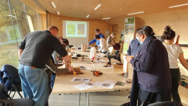 Le dimanche 7 novembre s’est tenu un atelier de construction d’abris pour la faune des jardins. Après une courte présentation sur la nécessité des abris pour la faune, les 9 personnes présentes ont chacune pu repartir avec un gîte à chauve-souris et un nichoir à rouge-gorge, fabriqués entièrement à partir de palettes de récupération. Une belle manière de revaloriser ces matériaux tout en donnant un coup de pouce à la nature !