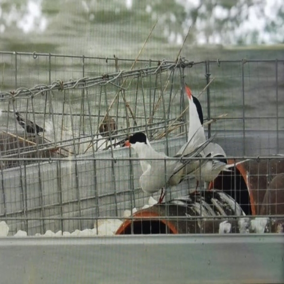 Bonne nouvelle : un couple de Sternes se pose régulièrement sur le radeau (cf. photo ci-dessous) ! Espérons que le couple nidifie et vienne renforcer la population. Affaire à suivre…
