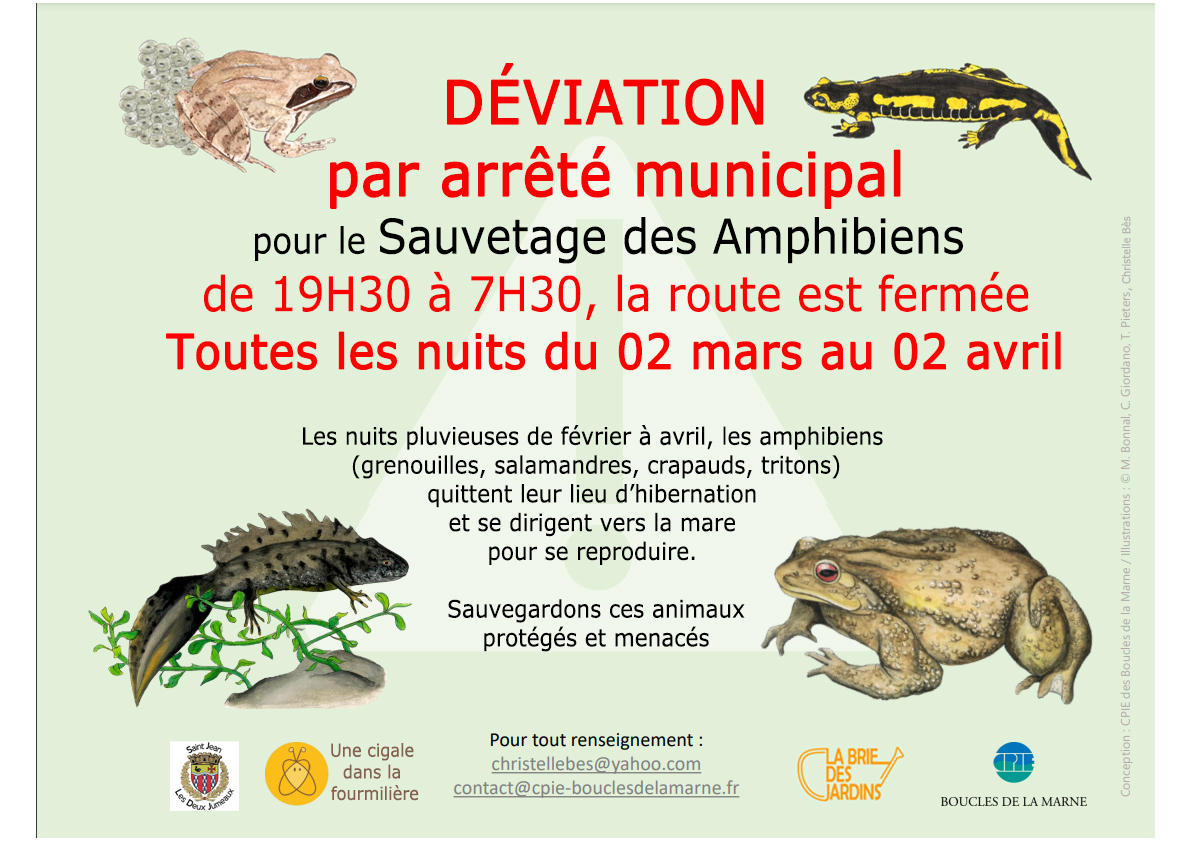 Adhérente et bénévole à l’association, Christelle a réussi à mettre en place, avec la Mairie de Saint-Jean-Lès-Deux-Jumeaux, un arrêté municipal pour fermer une route quelques soirs pendant le mois de mars. Cela permet aux amphibiens de traverser sans danger cette route mortelle, située entre leur site d’hivernage et de nourrissage en forêt, et leur site de reproduction, une grande mare au milieu d’un pré. Des barrières seront mises en place pour fermer la route et indiqueront une déviation à suivre pour les automobilistes. Des panneaux de sensibilisation seront également installés (voir ci-dessous).