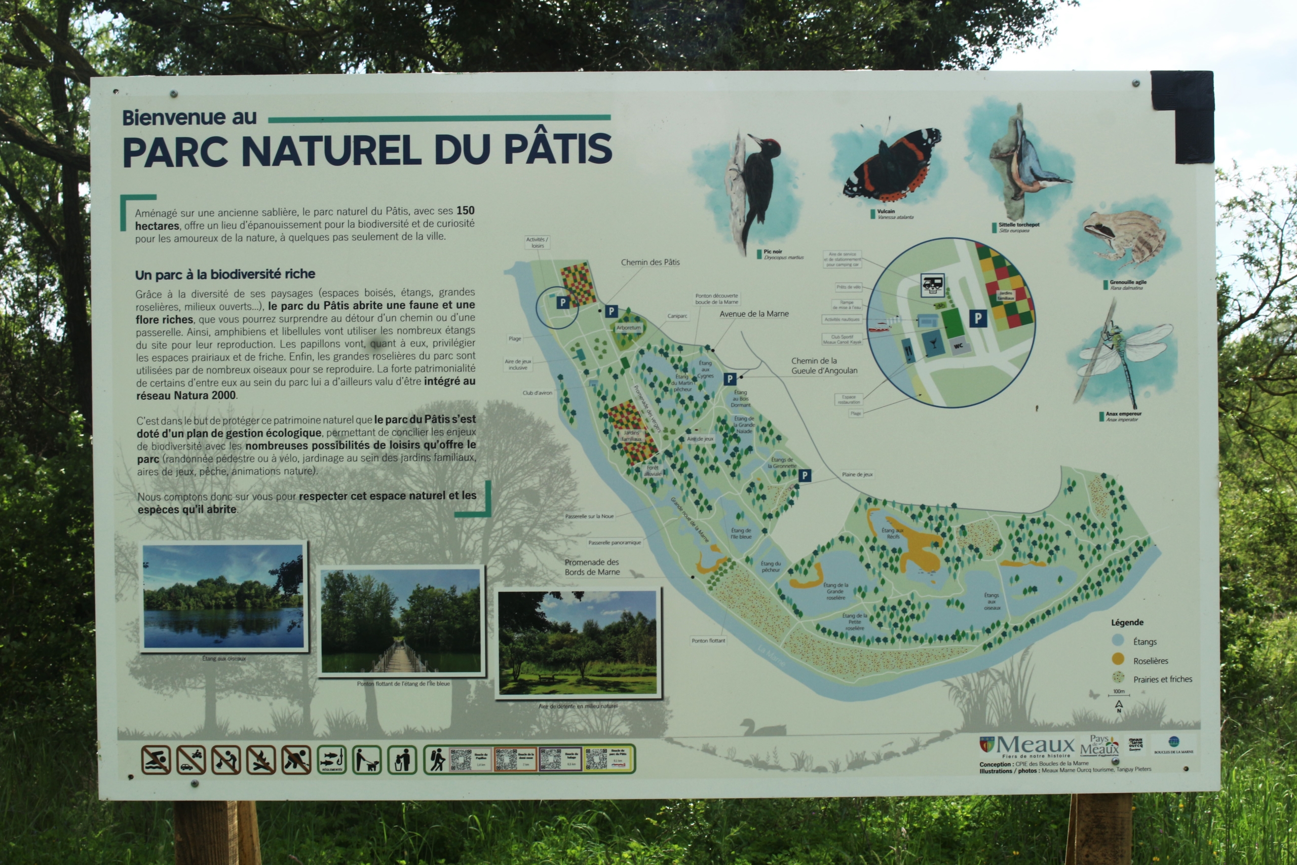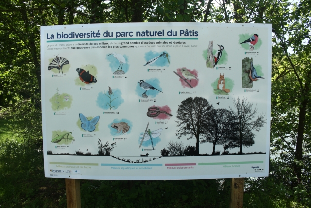 Au nombre de 6, ces panneaux présentent en quelques lignes le parc du Pâtis, la diversité d’espèces qu’il abrite ainsi qu’un plan détaillé du site. Le plan a été réalisé par l’Office de Tourisme Meaux Marne Ourcq.