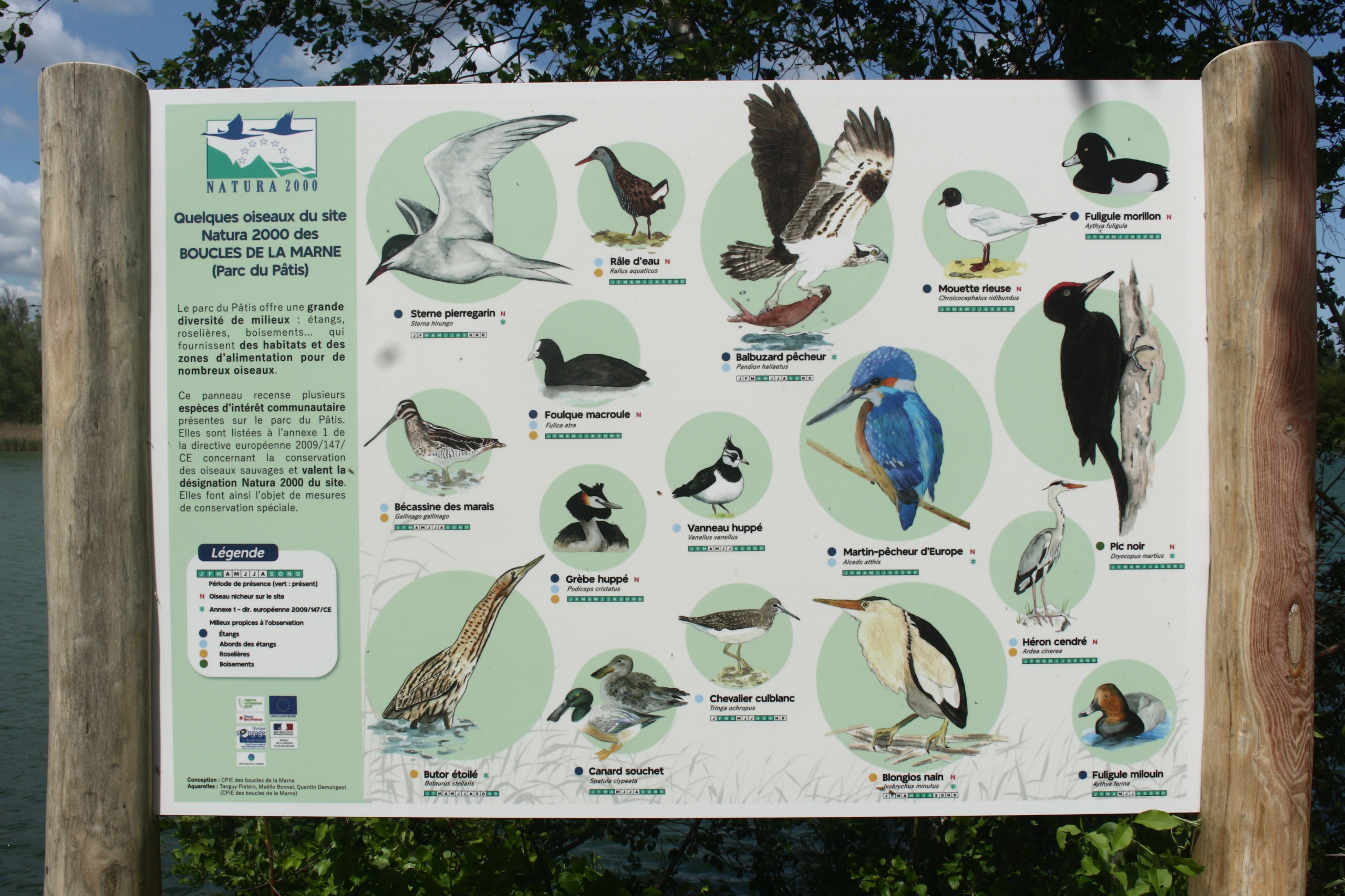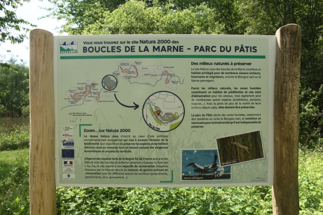 Ces deux panneaux présentent le site Natura 2000 des « boucles de la Marne » dans lequel est inclus une partie du Pâtis, ainsi qu’une partie des espèces d’oiseaux (toutes déjà observées dans le parc) qui lui ont valu ce classement. Financés par le programme Natura 2000, le contenu des panneaux a été rédigé avec l’aide d’Île-de-France Nature, qui est en charge de l’animation du site Natura 2000.