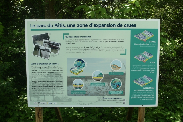 Ces panneaux, au nombre de 2, présentent le rôle de zone d’expansion de crues que joue le parc du Pâtis, en absorbant une partie de l’excédent d’eau lors des crues de la Marne. Les illustrations ont été fournies par EPISEINE, un dispositif de sensibilisation à la prévention des inondations.