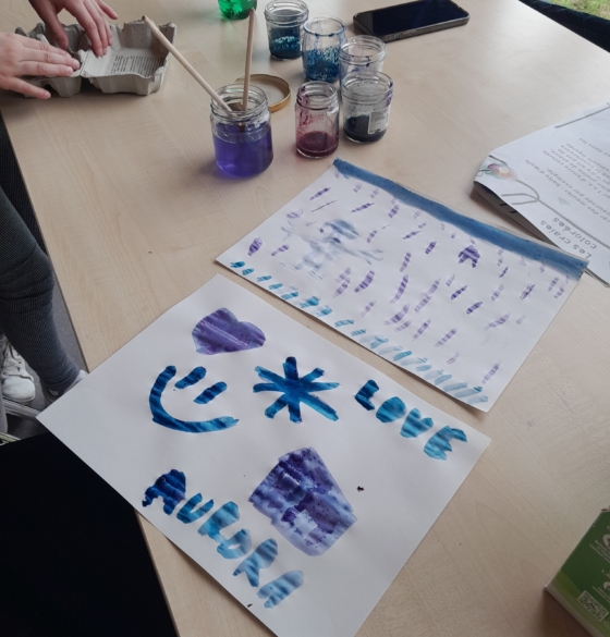 L’atelier du matin a permis de confectionner des encres et peintures végétales, de la colle et des craies colorées à partir d’ingrédients 100 % naturels tels que de la farine, du chou rouge, …
